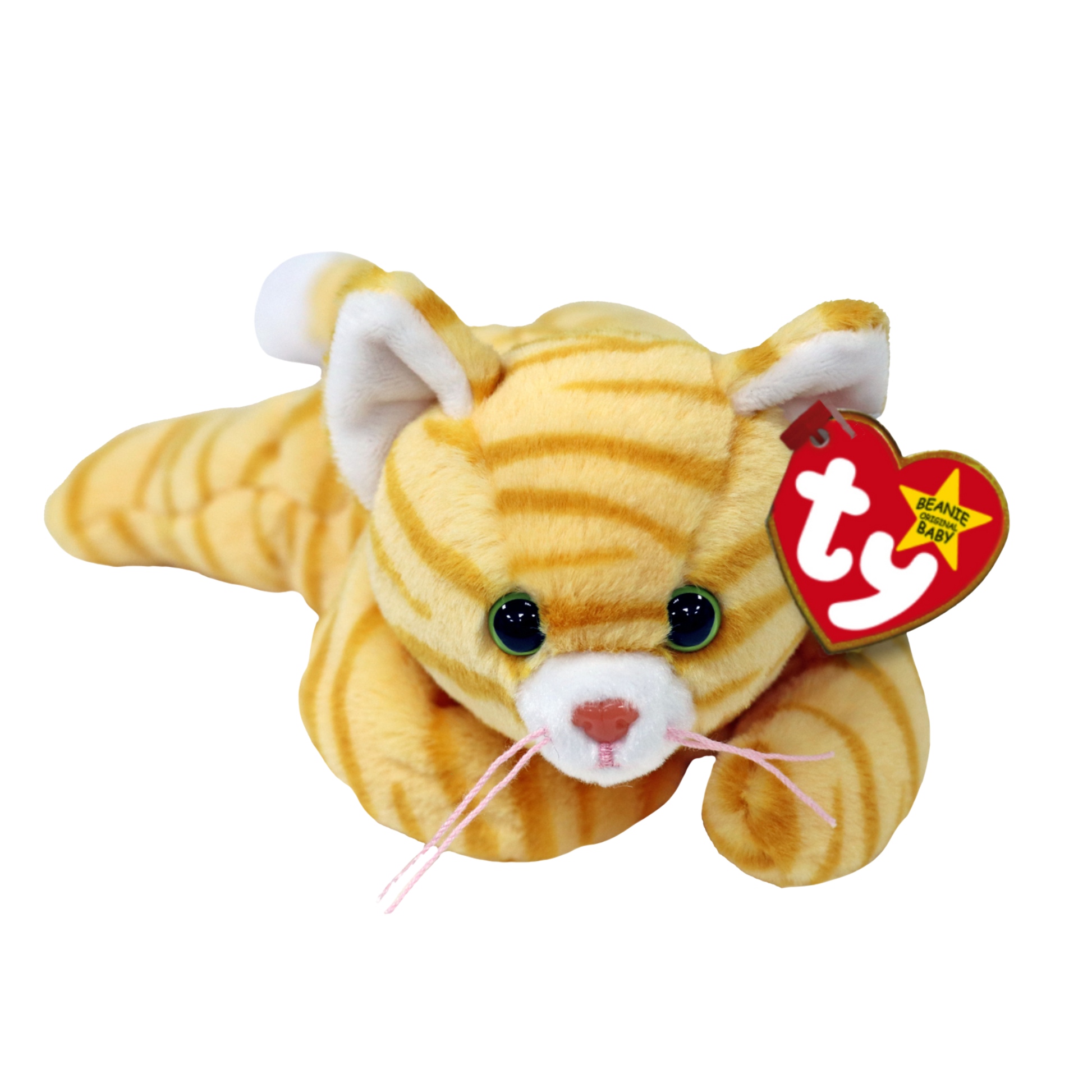 Amber II is a soft orange tabby cat decorated with darker orange stripes. She has striking green-and-black button eyes, a peach-colored nose, and delicate pale pink thread whiskers that make her extra sweet.
