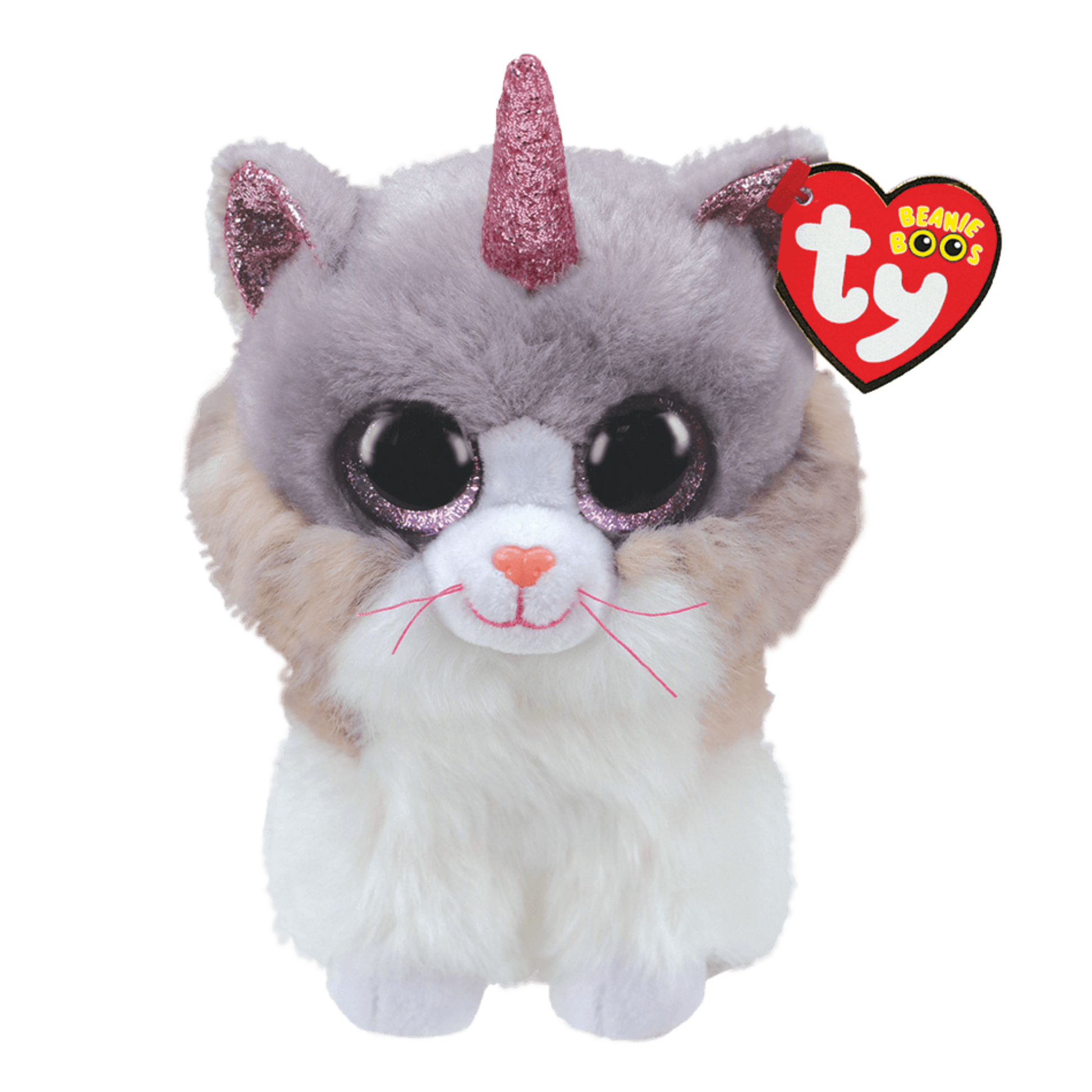 Asher is a fluffy white cat with a soft grey head and beige accents around her cheeks. She has big glittery pink button eyes, a peach-colored nose, and a stitched pink smile with matching whiskers. Her sparkly pink inner ears and shimmering pink unicorn horn make her a truly magical friend.