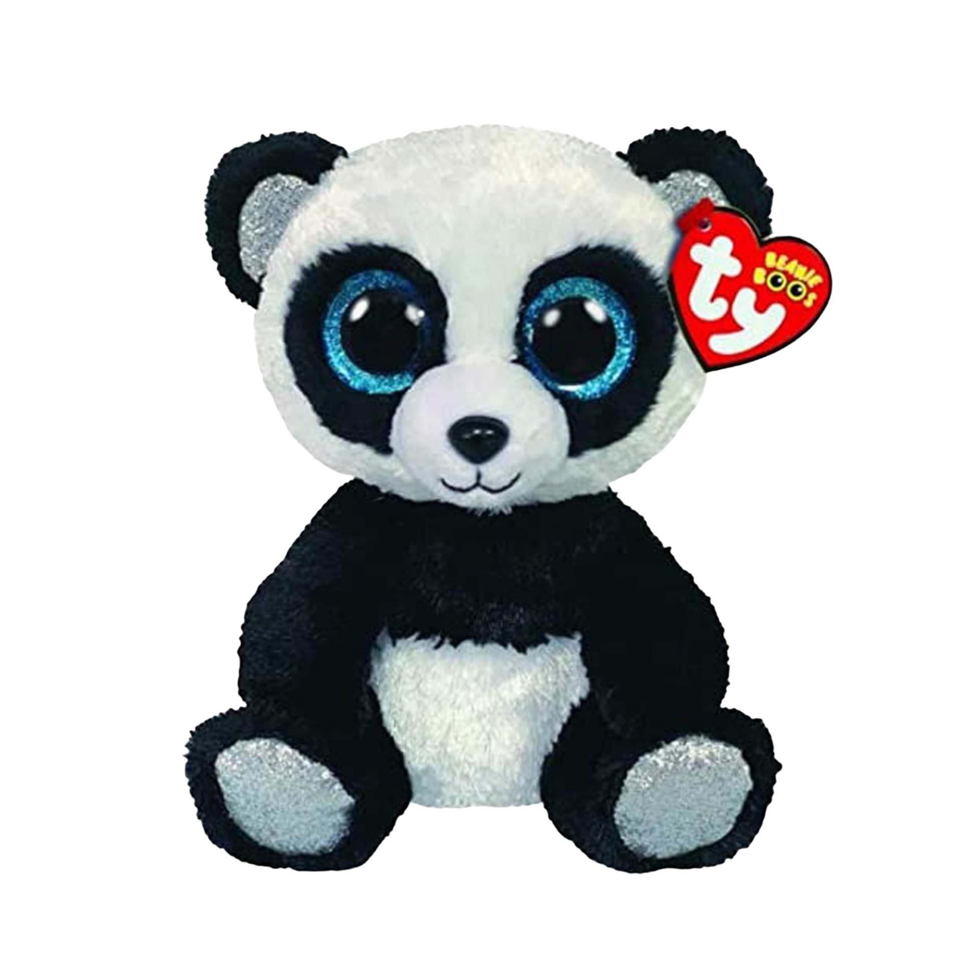 I’m a black-and-white panda with silvery pads and ears—a Beanie Boo you’ll treasure for years. My bright blue glittery eyes shine like the sky, but that’s not why I’m called Bamboo. The real reason? It’s because bamboo is my favorite treat!