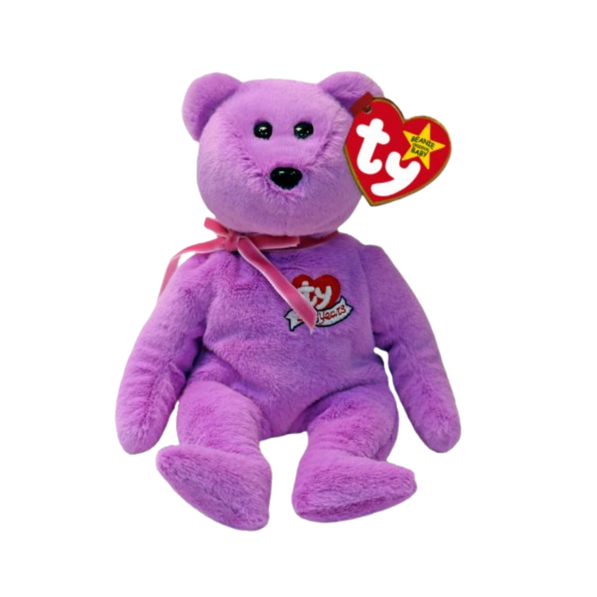 Celebrate II is a charming purple bear with classic black button eyes and a bold black nose. He wears a purple-pink ribbon around his neck and has an embroidered Ty heart on his chest with “30 Years” stitched beneath it, marking a special milestone.
