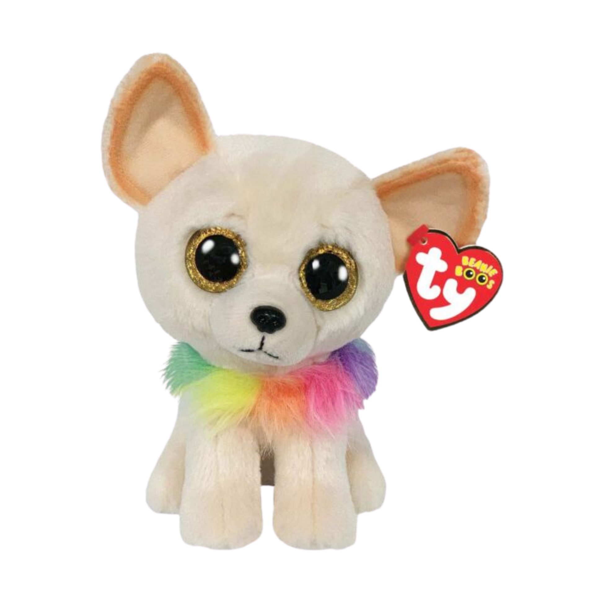 I’m Chewey, a tiny tan Chihuahua, just the perfect size to carry everywhere. My golden sparkle eyes shine bright, and my colourful rainbow collar adds a fun surprise. Soft and light in colour, I’m as sweet as can be, but if you find torn-up paper, you’ll know exactly who’s to blame!