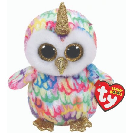 Enchanted is a magical owl with a soft rainbow-feathered pattern and a fluffy white face. Her large glittery gold eyes shine brightly, matched by her sparkly gold beak and feet. To top it all off, she wears a shimmering gold unicorn horn, making her truly one of a kind.