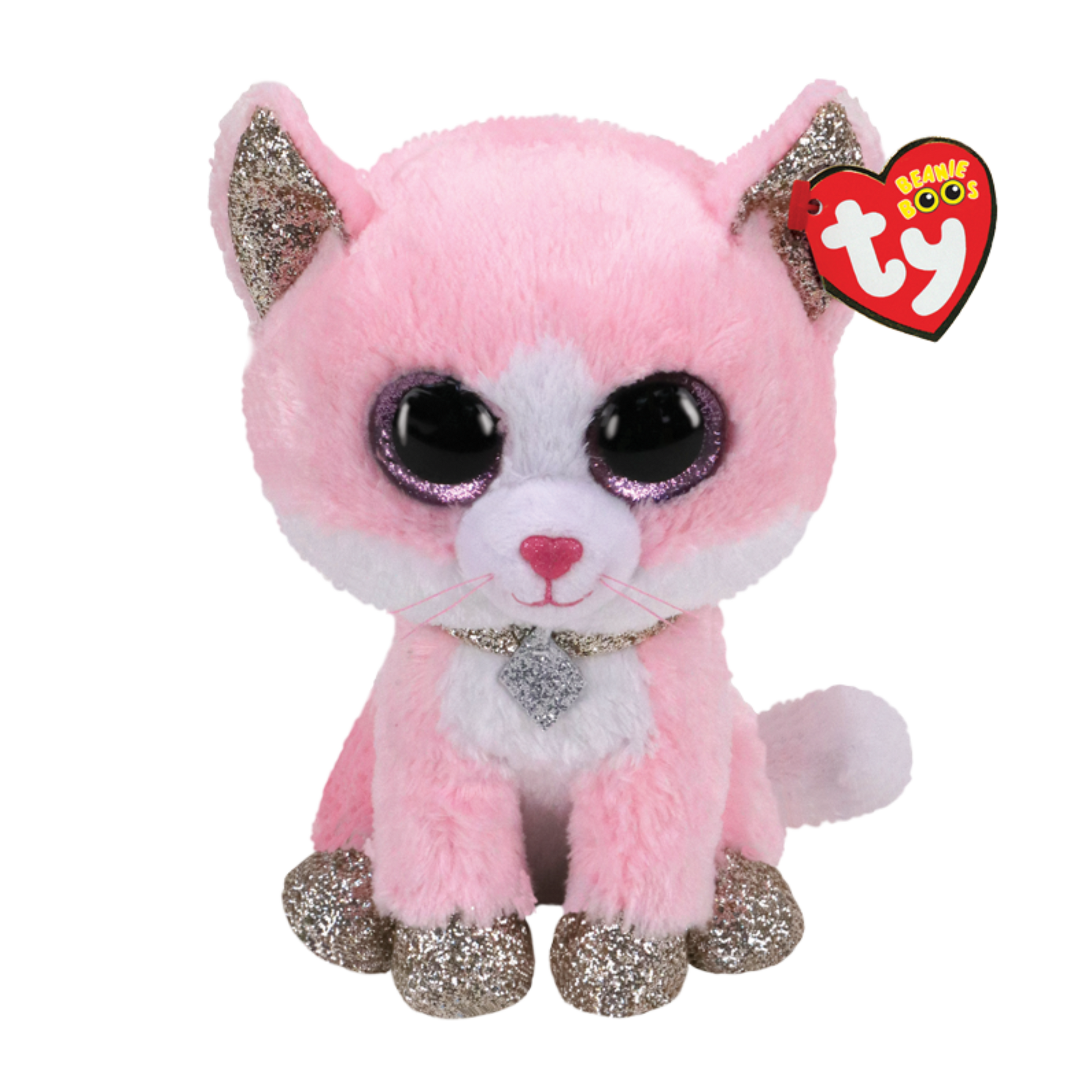 Fiona, the plush pink cat, dazzles with glittery feet and ears, perfectly paired with her sparkling necklace. Elegant and refined, this precious kitty is sure to stand out in any crowd. Bring this sweet girl home today and add a touch of charm to your world.