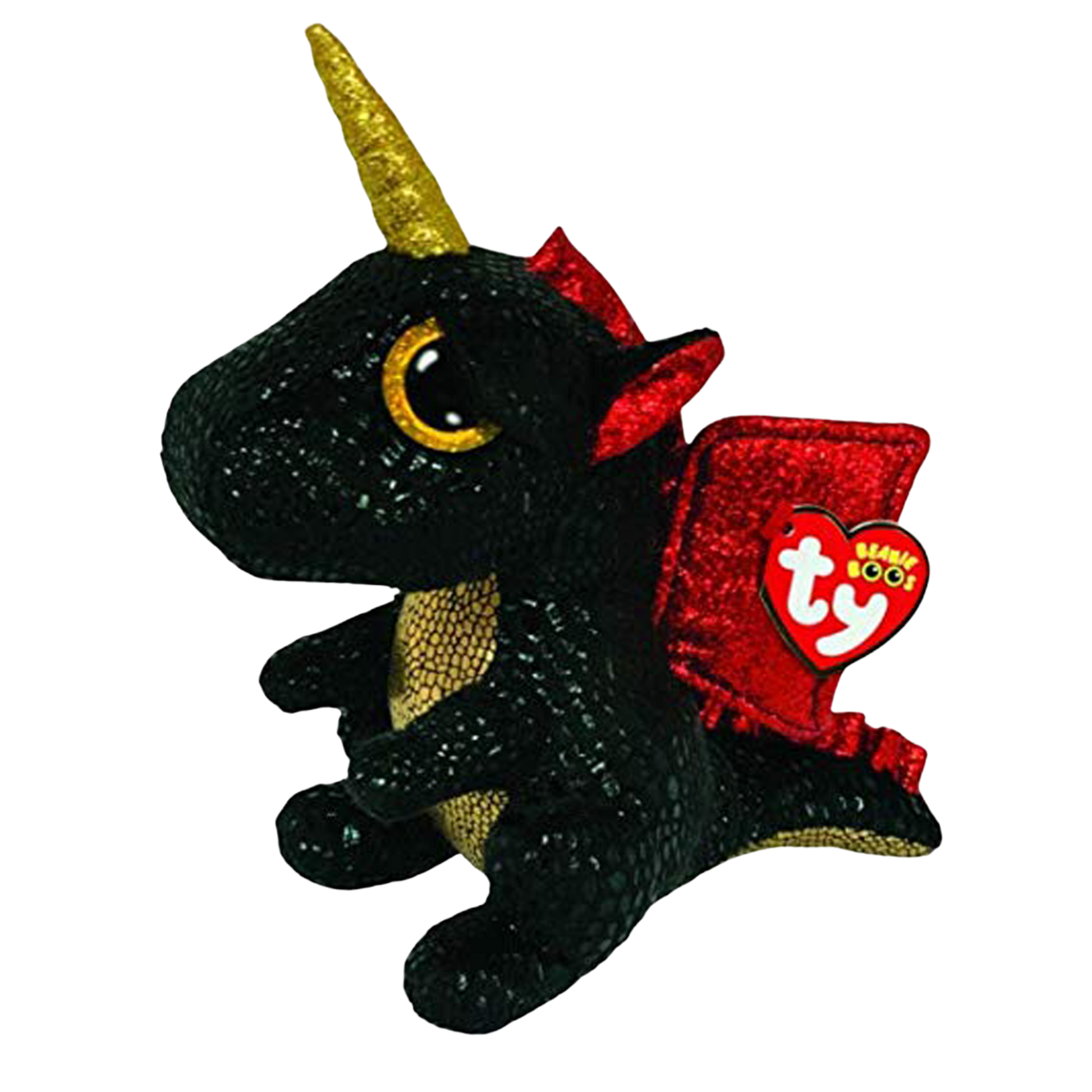 Grindal the dragon is a blend of legend and fun, with gleaming golden eyes and a matching gold chest. His silky-soft black scales shine like the night, while his glittering wings are ready to carry him on his next great quest.