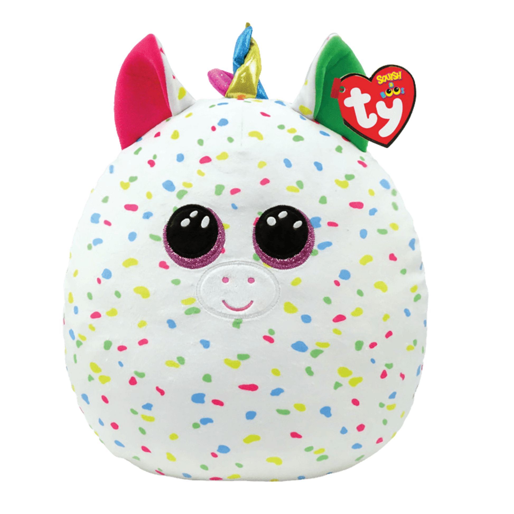 This magical Squishy Beanie unicorn is as colorful as can be! With a shimmering blue-and-gold horn, soft white body, and playful multicolored spots, it’s made for both snuggles and smiles. Sparkly pink eyes, a matching pink ear and tail, plus a contrasting green ear make this unicorn truly one-of-a-kind. Soft, squishy, and oh-so-huggable, it’s the perfect pillow pal for naps, playtime, or travel.