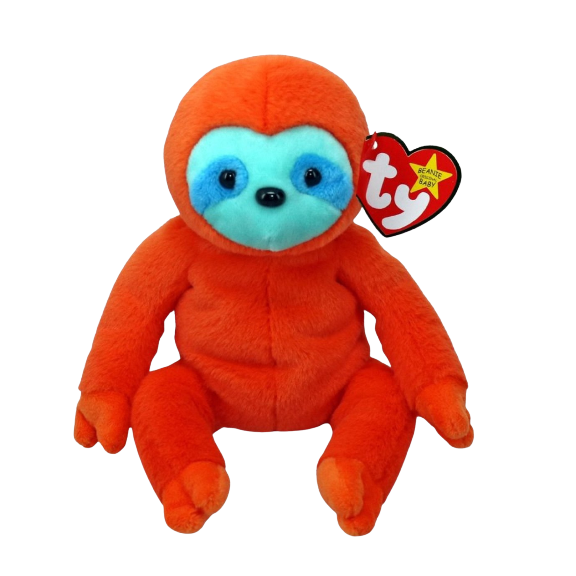 Molasses is a vibrant bright orange sloth with a soft, huggable body. His cheerful turquoise-blue face stands out with bold blue stripes over his eyes, giving him a playful and unique look. With his shiny black button eyes and little black nose, Molasses is full of charm and ready to bring a pop of color to any Beanie Baby collection.