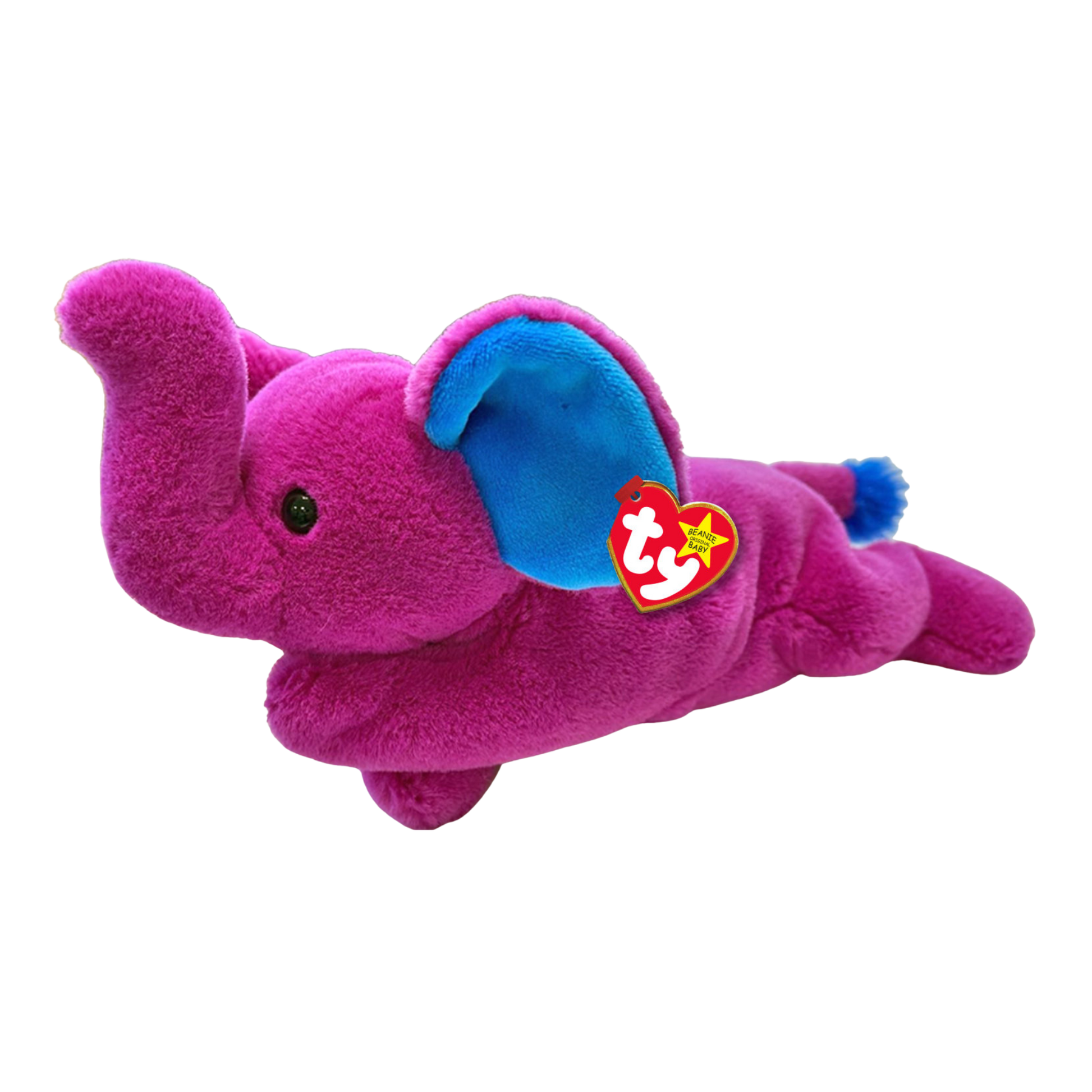 Peanut II is a vivid fuchsia elephant with oversized ears lined in soft blue. Her bright black button eyes shine above an upturned trunk, and a tuft of blue fur at the tip of her tail adds the finishing touch.