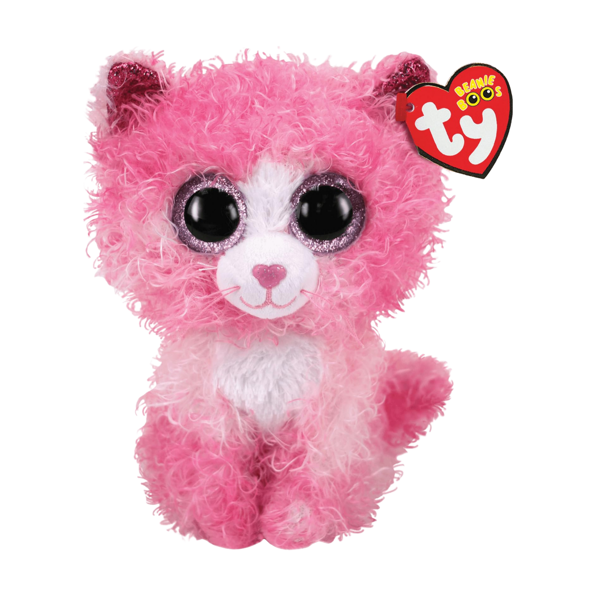 Reagan is a vibrant plush made from soft pink fabric sprinkled with blue spots and touches of purple. She has big sparkly pink-and-black button eyes, a glittery pink nose, and a stitched pink smile. Her white muzzle and belly make her extra cuddly, while her purple ears with shiny pink inner fabric add a playful pop of color. Part of Ty’s Beanie Boo collection, she’s instantly recognizable, brightly colored, wonderfully tactile, and a must-have for collectors!