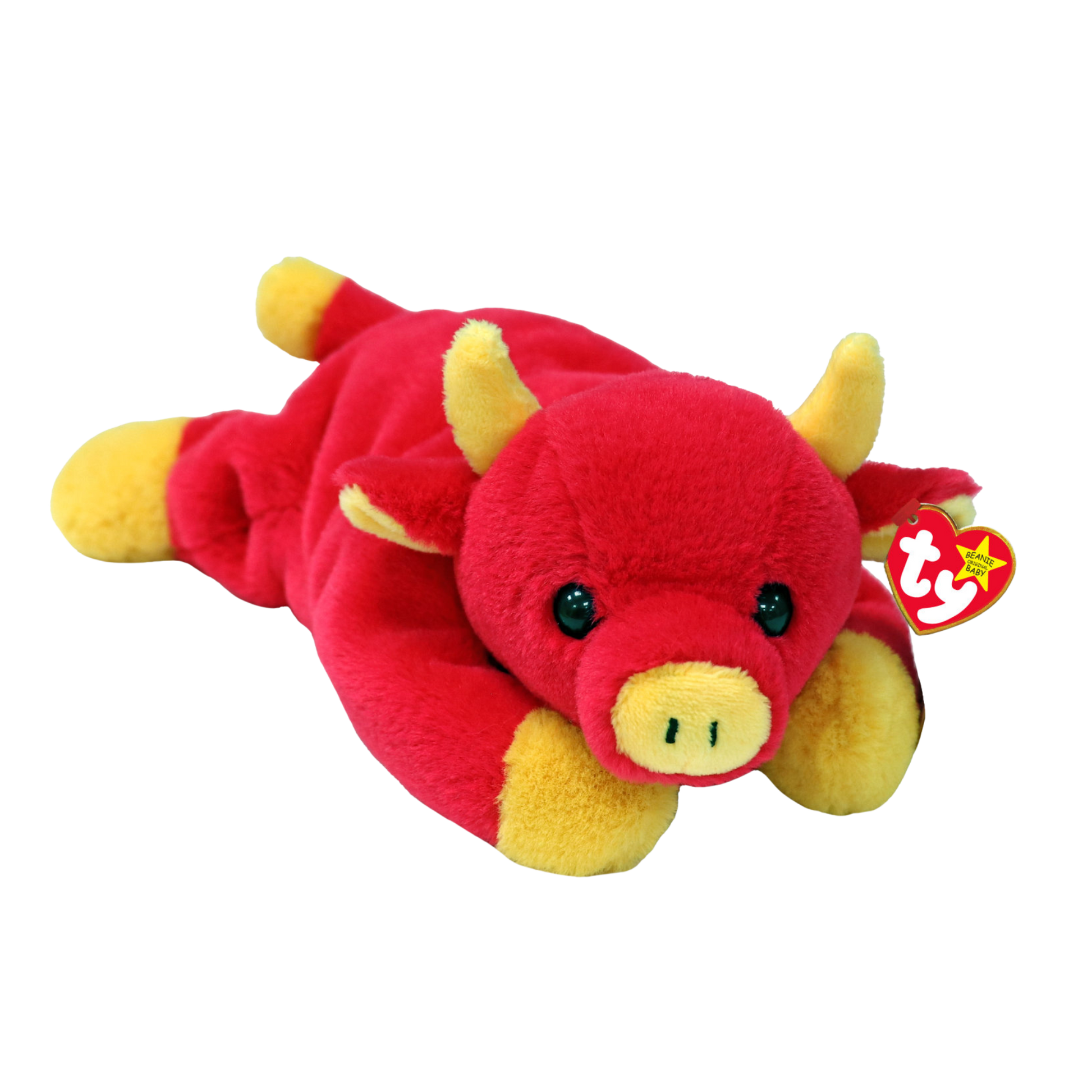 Snort II is a bold red bull with shiny black button eyes and cheerful yellow accents. His horns curve brightly above a golden-yellow snout, with matching hooves and a tail tipped in yellow to complete his lively look.