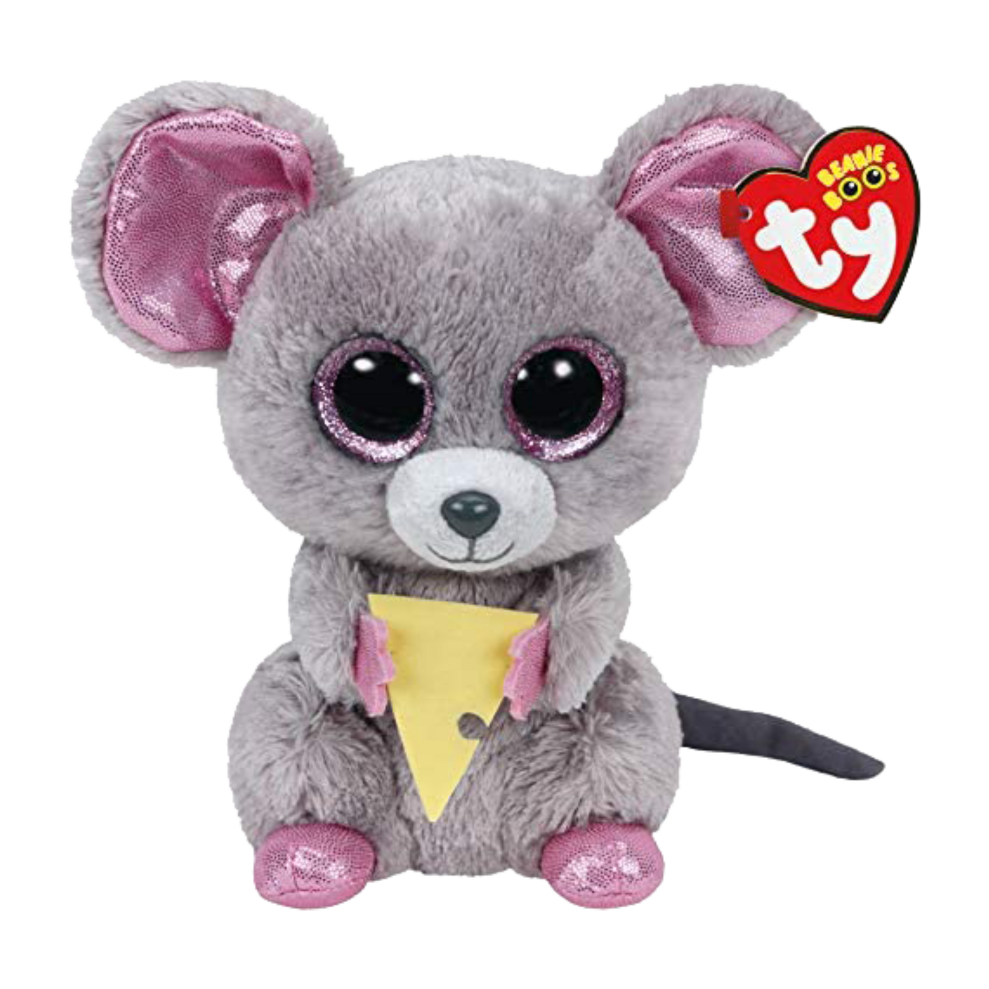 Squeaker is a cuddly little mouse made of soft grey fabric with a white muzzle and a black tail. His big sparkly pink-and-black button eyes shine above a tiny black nose and stitched smile. With pink felt hands, shiny pink ears and feet, he’s extra adorable—especially holding his bright yellow slice of cheese!
