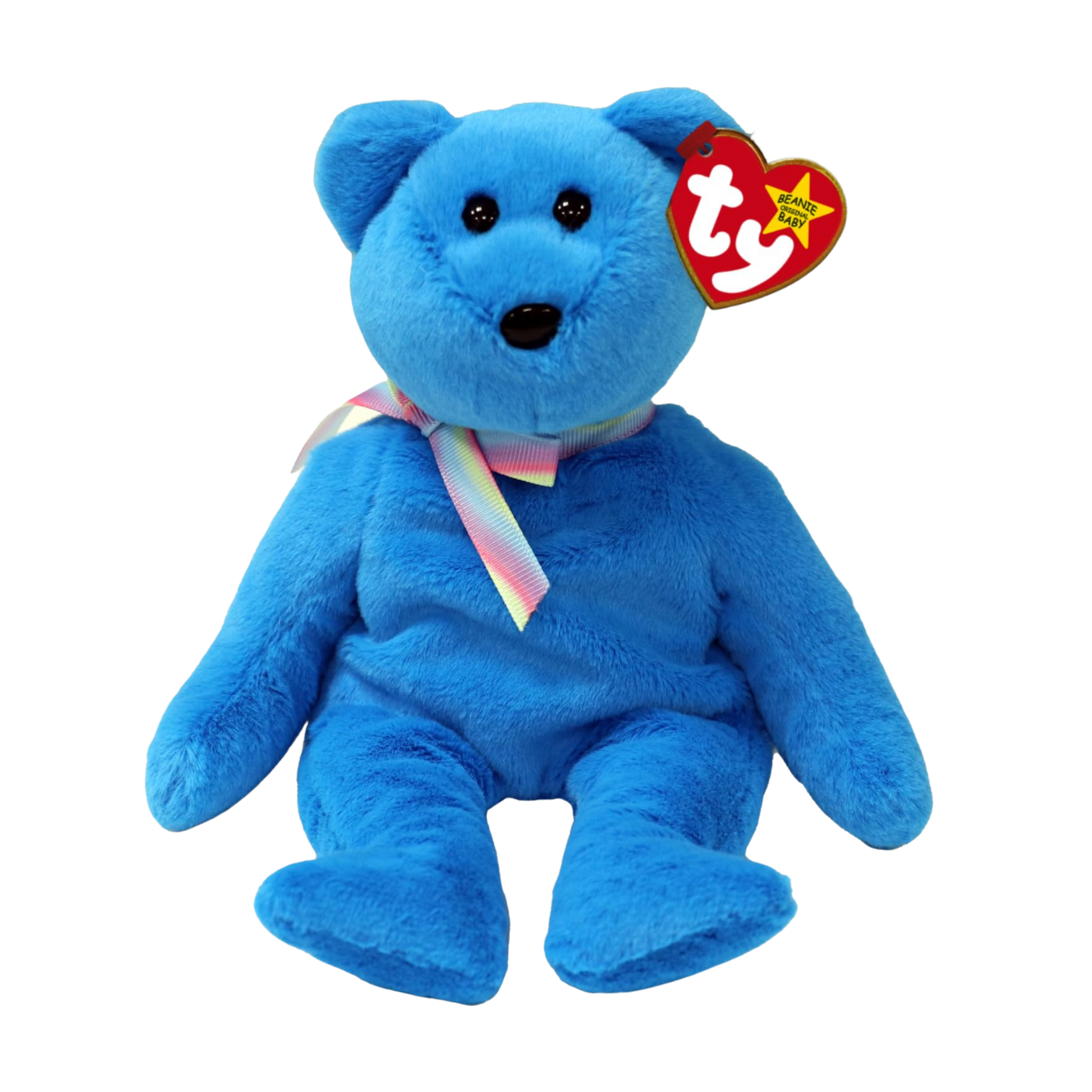 Blue Teddy II is a soft blue bear with classic black button eyes and a big black nose. Around his neck, he wears a cheerful multicolored ribbon, adding a bright and playful touch to his look.