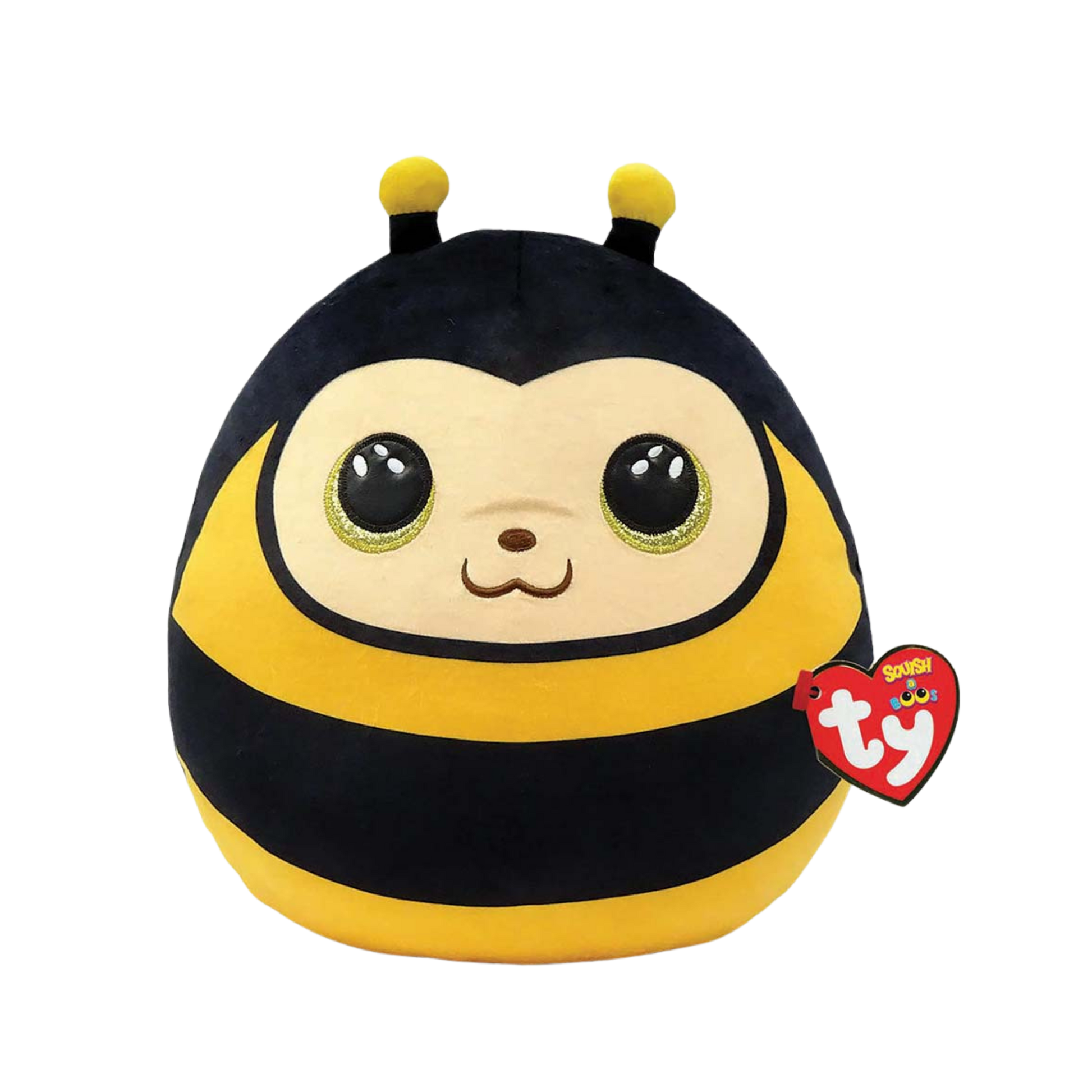 Zinger is a cheerful yellow bee with a round body, a black head, and a bold black stripe across his middle. His sparkly golden eyes shine brightly above a soft peach face, complete with a sweet brown nose and smile. Perched on top of his head are two tiny black-and-yellow antennae, adding to his charming look.